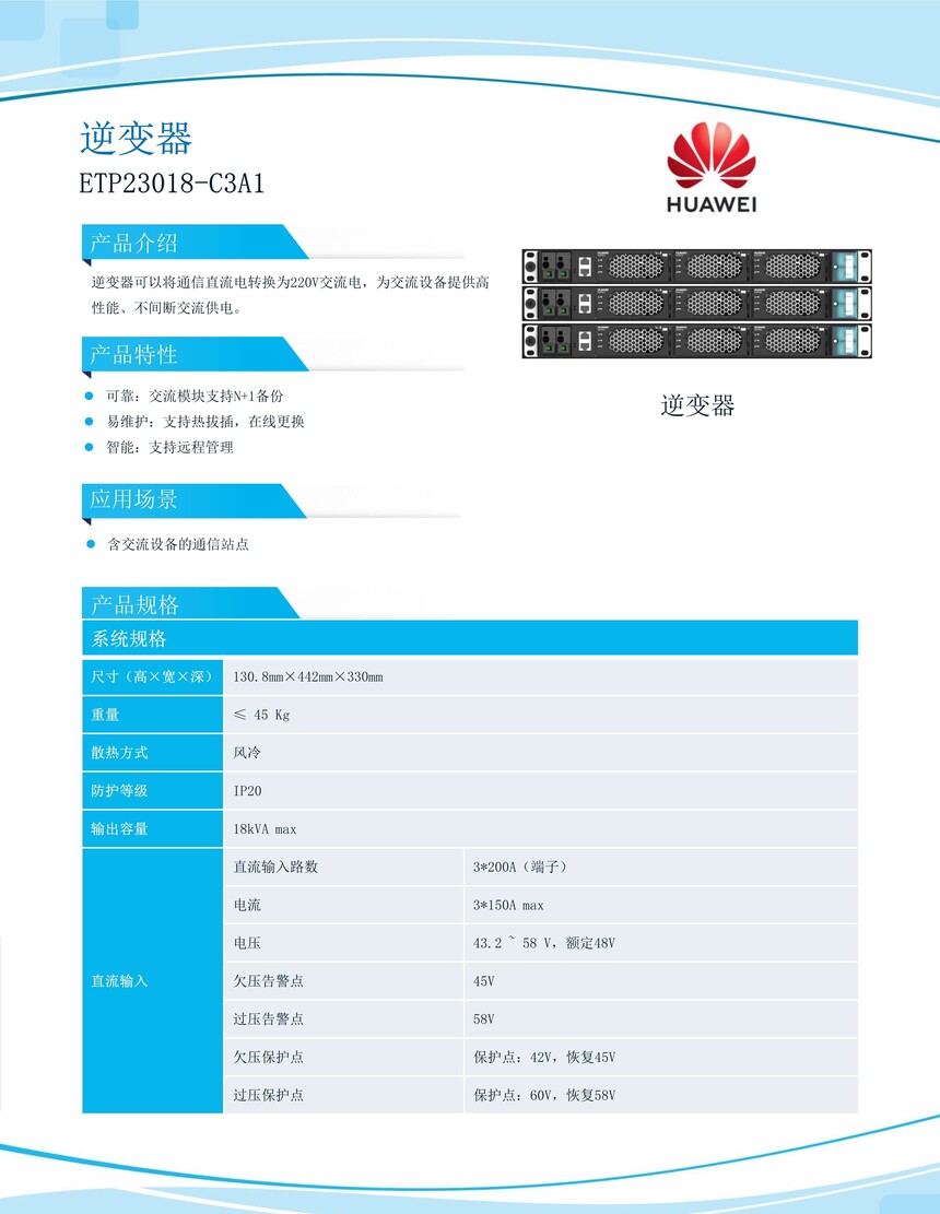 华为逆变器ETP23006-C1A1、ETP23012-C2A1和ETP23018-C3A1,可将-48V DC转换为220V AC/230V AC,为交流设备提供高性能供电。